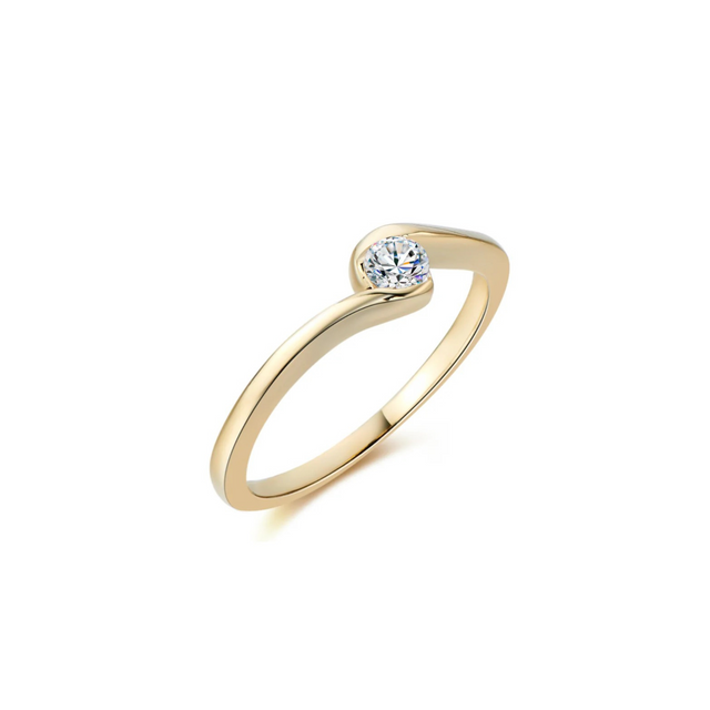 Klasyczny duet złota i diamentu przybrał formę nowoczesnej elegancji. Kamień o masie 0,15 ct delikatnie mieni się w otoczeniu lśniącego złota próby 585. Szlachetny metal subtelnie otula diament wydobywając jego naturalne piękno. Pełna oprawa dodaje kamieniowi uroku zapewniając jednocześnie solidne połączenie ze złotem. Pierścionek jest stylową ozdobą kobiecej dłoni.Wszystkie oprawiane diamenty są w szlifie minimum very good, dzięki czemu wyróżniają się pięknym blaskiem.